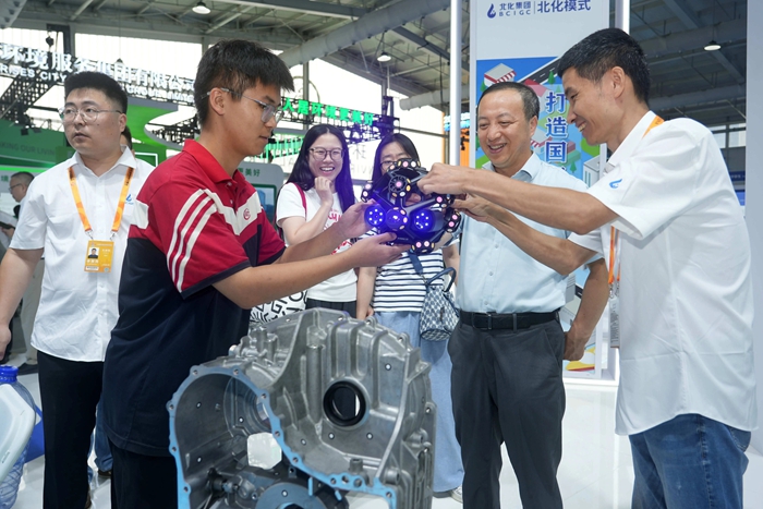 致力于职业技能人才培养的技师学院,在互动中呈现世界技能大赛金牌项目——机电一体化的卓越成果,学院以人机互联的3D扫描和工业机器人吸引了大批参观者驻足,让观众近距离感受产教融合的创新实践和“化工+教育”的协同价值。